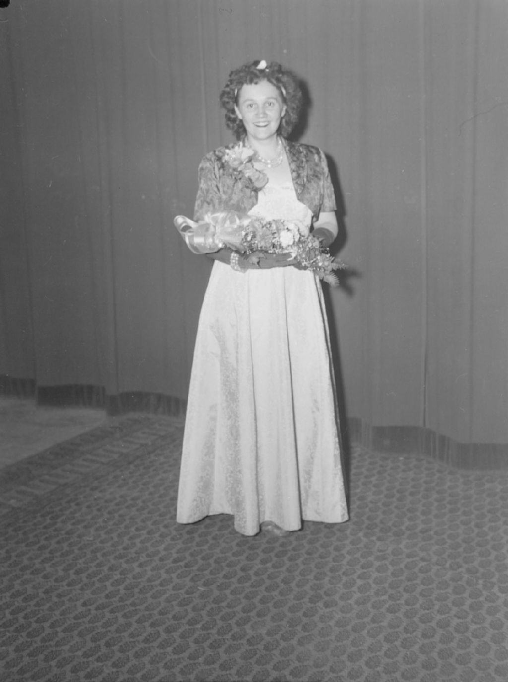Jeannine Sauvé, en robe longue, tient une gerbe de fleurs