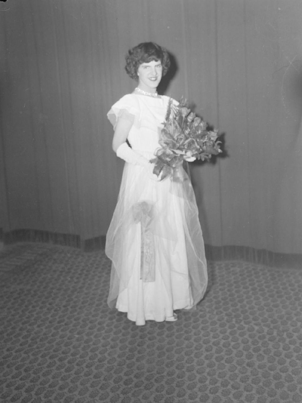 Jeannine Métivier, en robe longue, tient une gerbe de fleurs