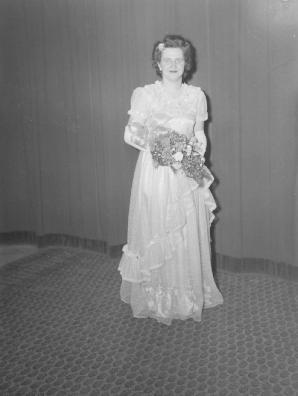 Paulette Lagacé, en robe longue, tient une gerbe de fleurs