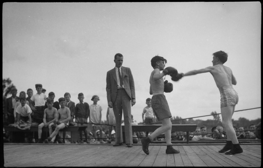 Lors de compétitions sportives écossaises, «The Caledonian Games» à Montréal, nous apercevons sur un ring extérieur un combat de boxe entre deux garçons en tenue de boxeur