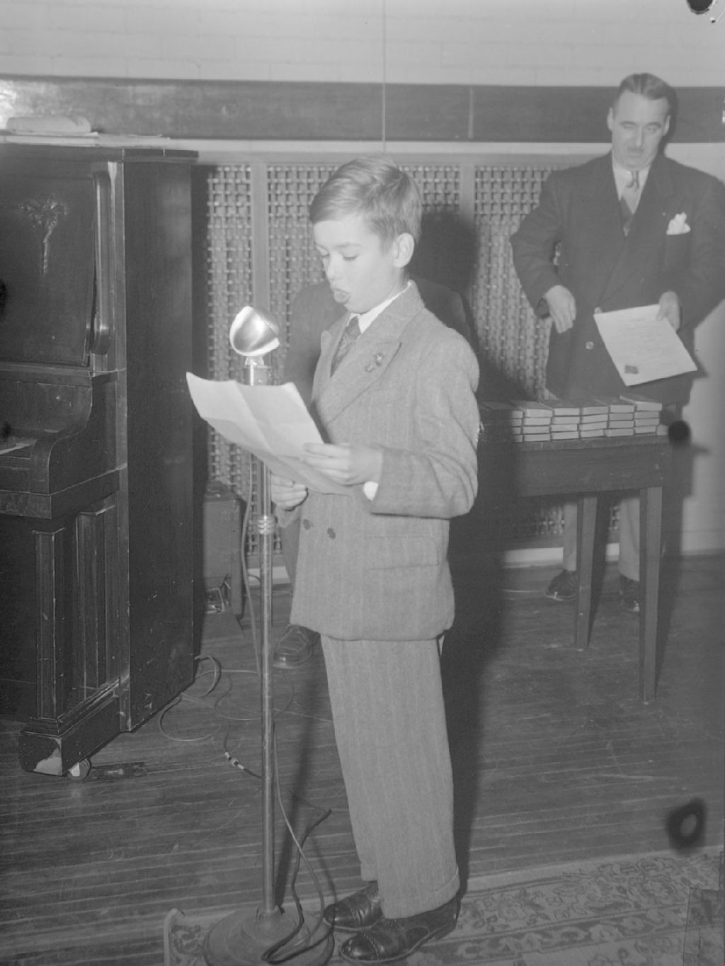 Un élève de King's School à Westmount lit un texte au microphone lors du spectacle de Noël