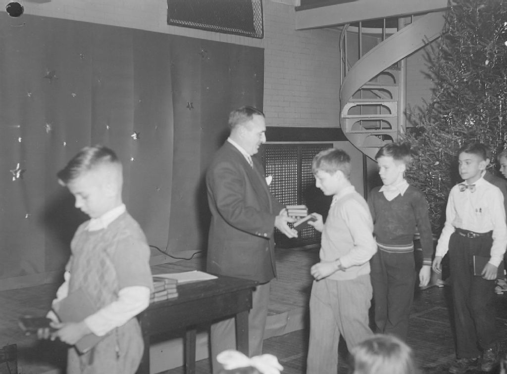 Un homme remet des livres à des élèves de King's School à Westmount lors du spectacle de Noël