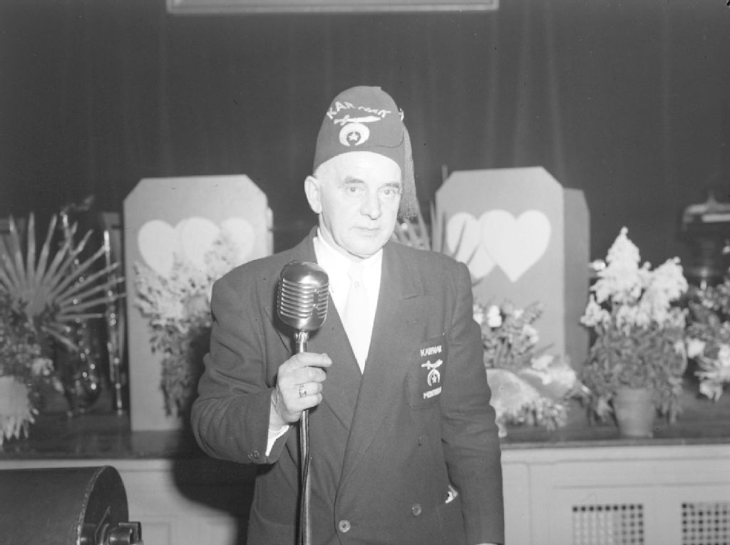 Un membre de la patrouille arabe du Karnak Temple Mystic Shrine situé rue Sherbrooke Ouest à Montréal parle au microphone. Il est coiffé d'un fez sur lequel sont représentés un sabre, un croissant et une étoile