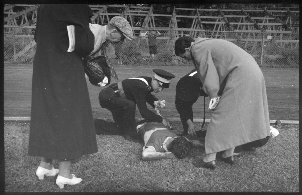 Lors de compétitions sportives organisées par les corps policiers au stade Delorimier à Montréal, nous voyons un athlète blessé, couché au sol, entouré d'un policier et de quelques spectateurs