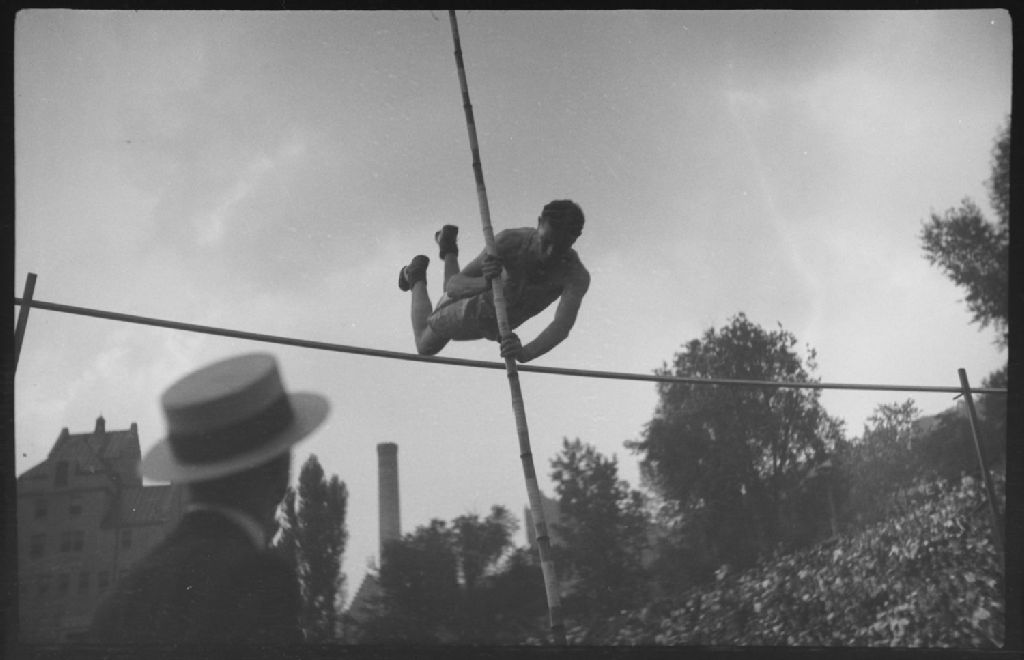 Lors de compétitions sportives organisées par les corps policiers au stade Delorimier à Montréal, nous voyons un athlète, un dénommé Doyle, portant le numéro 38, exécutant un saut à la perche