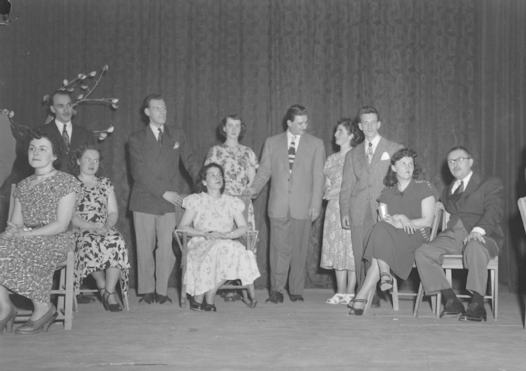 Des comédiens jouent dans une pièce de théâtre présentée à la Comédie canadienne (devenue Théâtre du Nouveau Monde), située rue Sainte-Catherine Ouest à Montréal