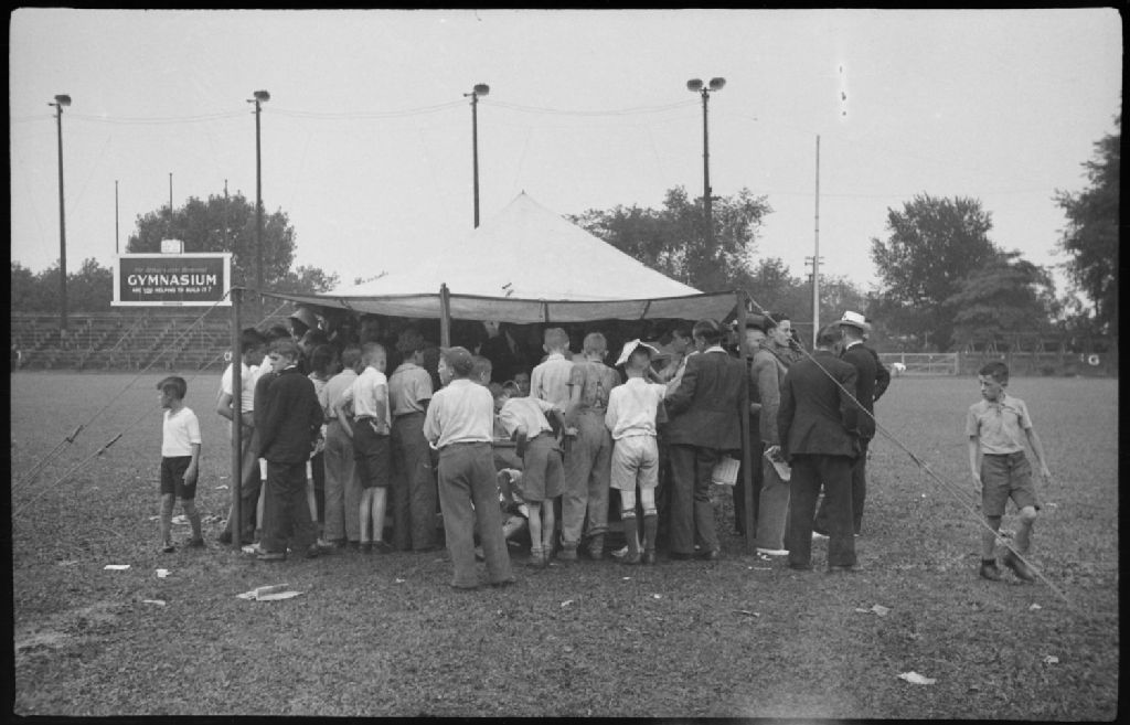 Lors de compétitions sportives organisées par les corps policiers au stade Delorimier à Montréal, nous voyons un petit groupe de personnes en tenue de ville, réunies près d'un kiosque