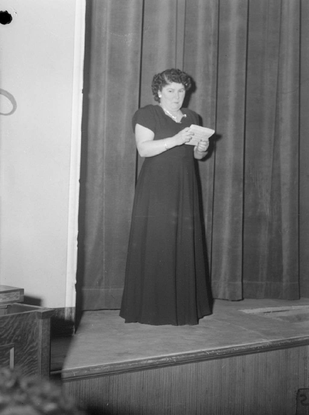 Nous voyons une dame, en robe longue, sur la scène de la Comédie canadienne (devenue Théâtre du Nouveau Monde), située rue Sainte-Catherine Ouest à Montréal