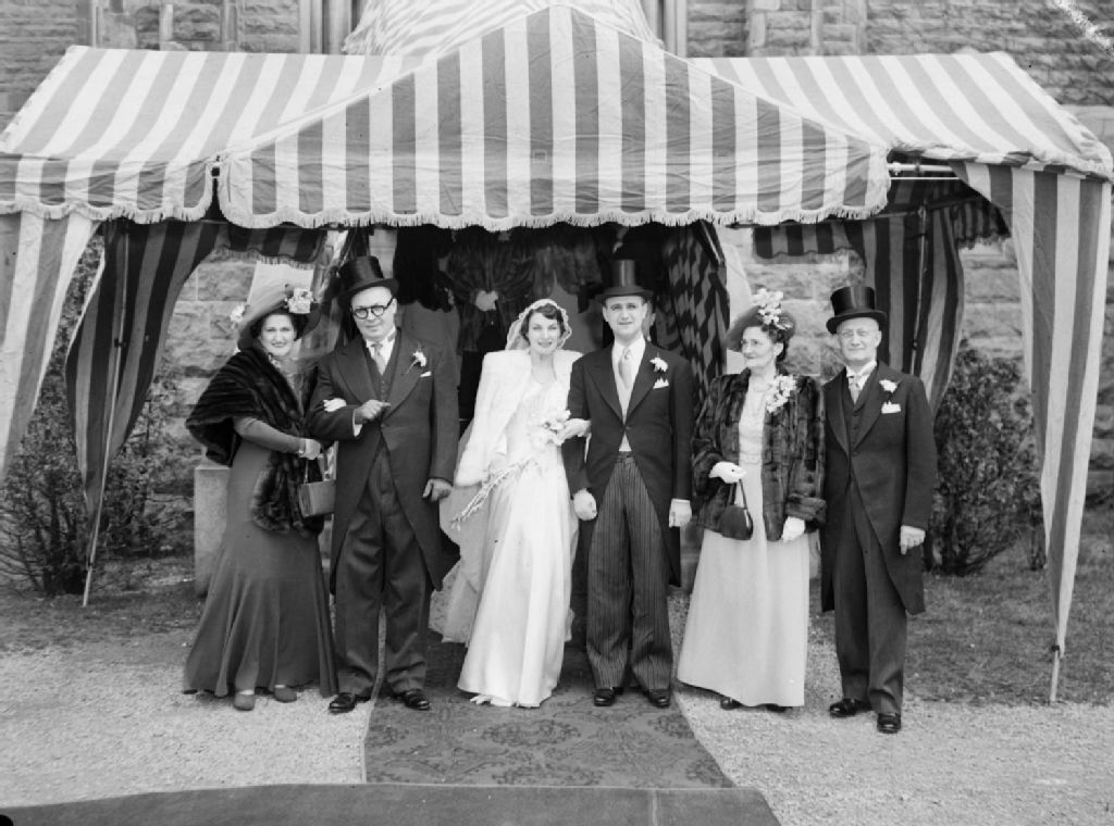 Les nouveaux mariés, les Ménard-Fortin, et leurs parents se tiennent sous la marquise tendue au-dessus de l'entrée de l'église où leur mariage a été célébré. Les dames portent des manteaux de fourrure