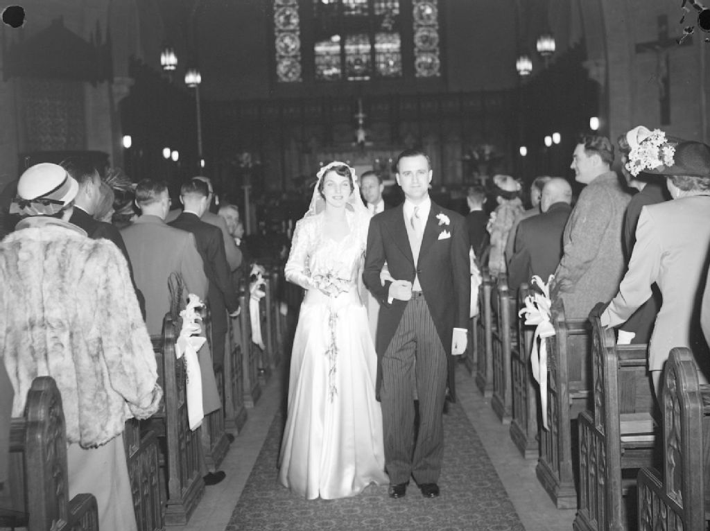 Les nouveaux mariés, les Ménard-Fortin, marchent dans la nef de l'église où leur mariage a été célébré. Il s'agit de St. Paul's Church of Scotland (devenue Musée d'art de Saint-Laurent) située sur le boulevard Sainte-Croix à Saint-Laurent