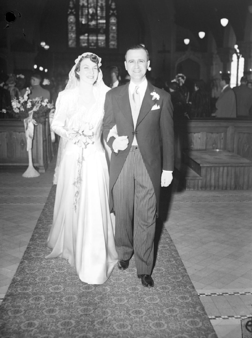 Les nouveaux mariés, les Ménard-Fortin, marchent dans la nef de l'église où leur mariage a été célébré. Il s'agit de St. Paul's Church of Scotland (devenue Musée d'art de Saint-Laurent) située sur le boulevard Sainte-Croix à Saint-Laurent