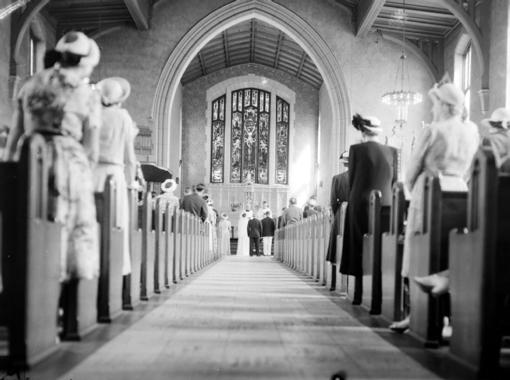 Nous voyons le choeur et la nef de Trinity Memorial Church située rue Sherbrooke Ouest à Montréal pendant la célébration du mariage du couple Cook-Honey