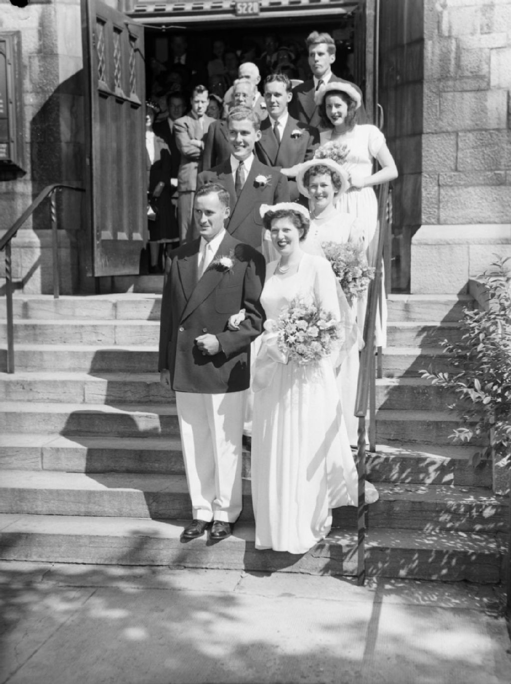 Les nouveaux mariés, les Cook-Honey, et leurs invités sont sur les marches extérieures de Trinity Memorial Church située rue Sherbrooke Ouest à Montréal