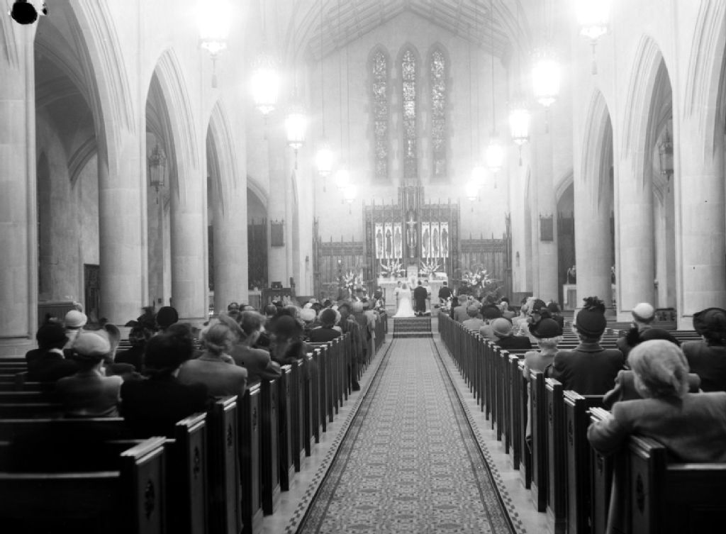 Nous voyons le choeur et la nef de l'église Church of the Ascension of Our Lord de l'avenue Kitchener à Westmount. Le mariage du couple Griffin-McCaffrey y est célébré