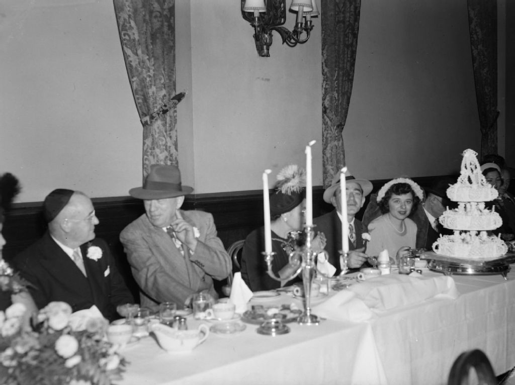 Nous voyons les convives de la table d'honneur de la réception de mariage des Teach-Singerman. Les hommes sont coiffés d'un chapeau de feutre et un invité porte une calotte