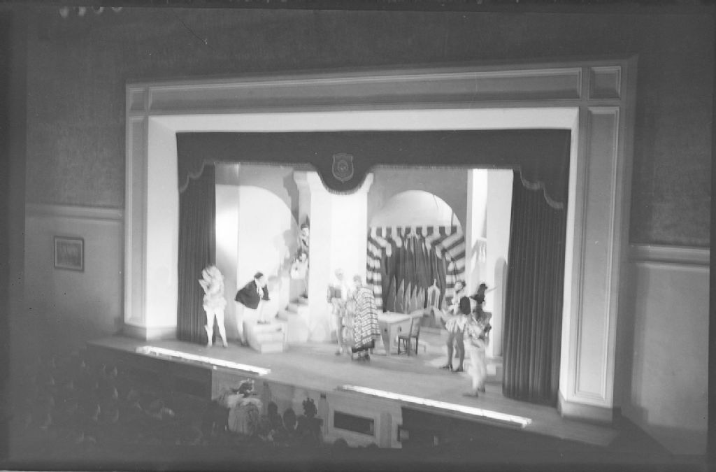 Sur la scène d'un théâtre, nous voyons des comédiens qui participent à une représentation de «La mégère apprivoisée» de William Shakespeare. Nous voyons la scène où évoluent des comédiens habillés en pourpoints avec fraise (collerette). Au centre, nous apercevons un comédien portant une cape longue. Dans le parterre, nous remarquons, parmi les spectateurs, un comédien coiffé d'une couronne de fleurs