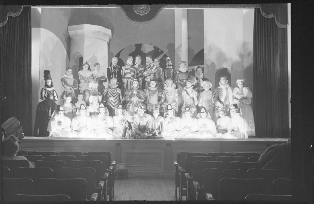 Sur la scène d'un théâtre, nous voyons des comédiens et des comédiennes qui participent à une représentation de «La mégère apprivoisée» de William Shakespeare. Les femmes sont vêtues de robes à paniers et portent des chapeaux. Les hommes sont habillés de pourpoints avec fraise (collerette) et hauts-de-chausses. Nous remarquons un comédien coiffé d'un chapeau à la ressemblance d'un hennin