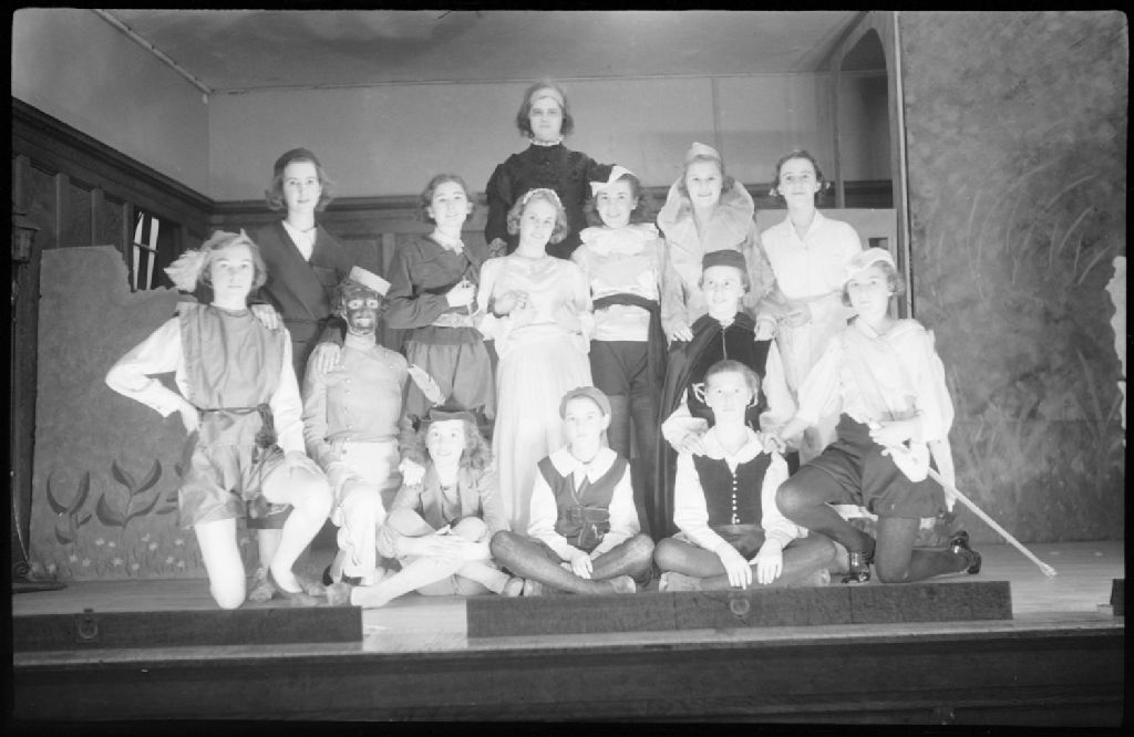 Sur la scène d'un théâtre, nous voyons une troupe de comédiennes habillées en costume d'inspiration Renaissance, c'est-à-dire pourpoints et hauts-de-chausses pour les comédiennes jouant un rôle d'homme et robes longues pour les femmes. Nous remarquons une comédienne jouant le rôle d'un maure. Les participantes sont membres du mouvement des guides