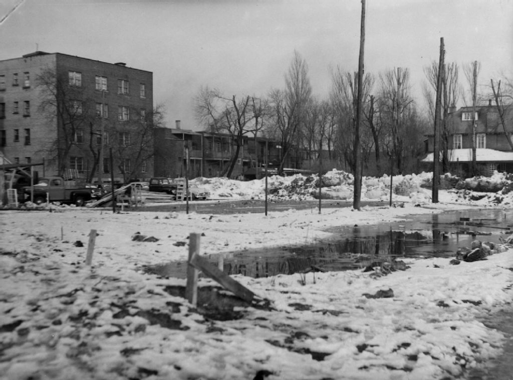 Aux abords d'un terrain vague, nous voyons des maisons à appartements. Nous remarquons des camions et des automobiles stationnés