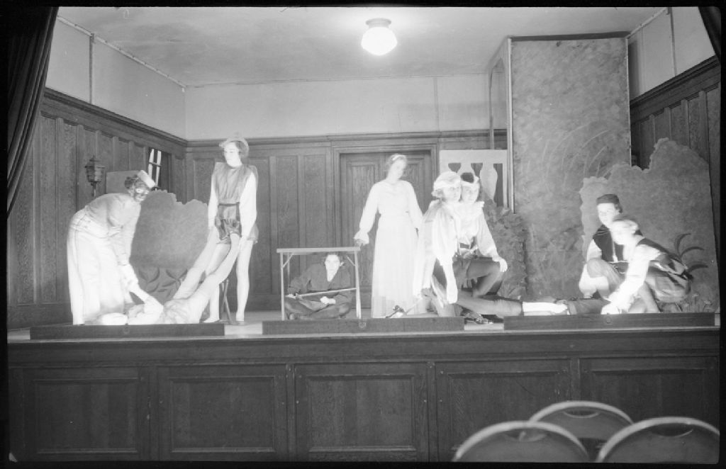 Sur la scène d'un théâtre, nous voyons des comédiennes jouant la pièce «Roméo et Juliette» de William Shakespeare. Nous remarquons que les costumes: hauts-de-chausses, pourpoints et robes longues. Nous voyons une comédienne accroupie sous une table et tenant une épée. Près d'elle, deux comédiennes en soulèvent une autre qui simule la mort. Les participantes sont membres du mouvement des guides