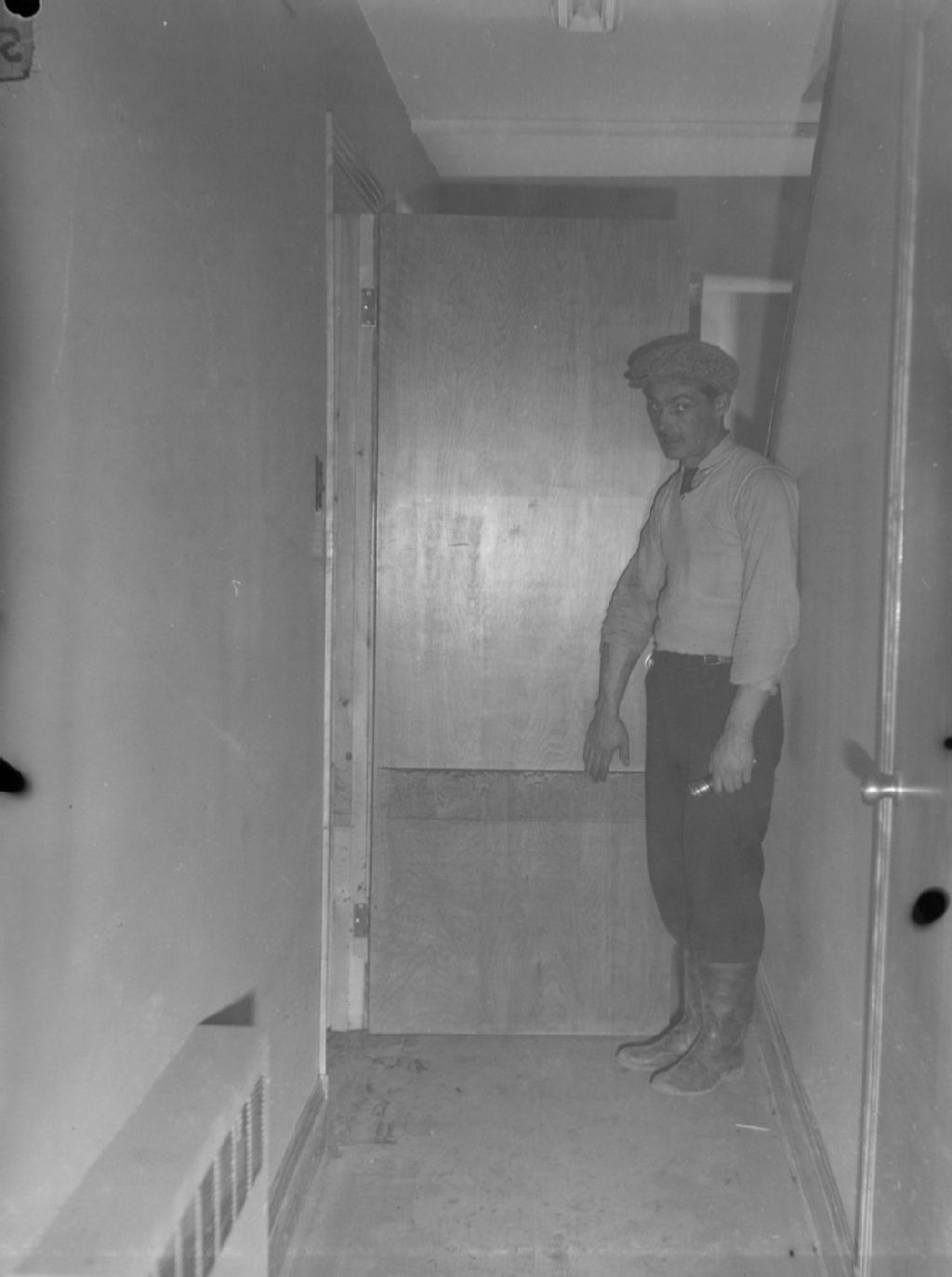 Dans un édifice en construction, un ouvrier est debout dans un corridor. Il tient une lampe de poche