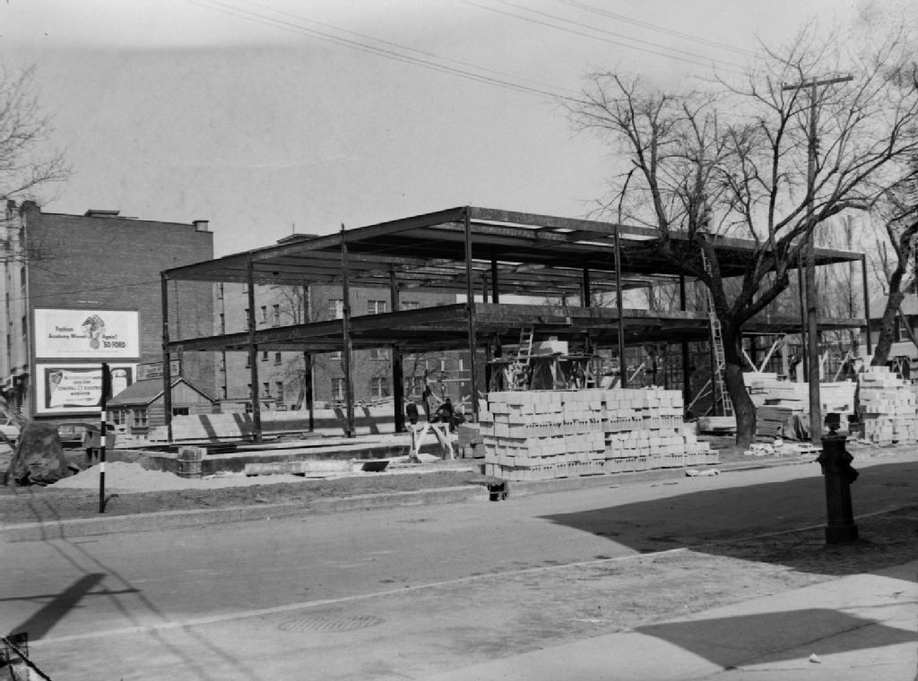 Le nouvel édifice en construction du concessionnaire de pièces d'automobiles Hodge Bros. Nous remarquons près de l'ancien local de vente, deux panneaux publicitaires de Ford et de General Electric