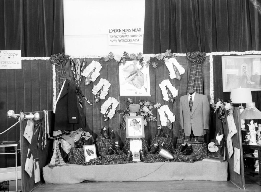 Un étalage d'articles vestimentaires pour hommes du magasin London Men's Wear, situé au 5758 rue Sherbrooke Ouest à Montréal. Nous remarquons parmi les articles exposés, des vestons, des chemises, des cravates, des chapeaux et des bas