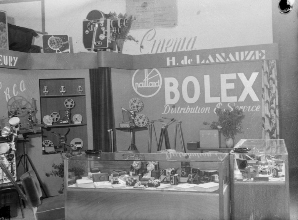 Nous voyons un étalage d'accessoires pour le cinéma du concessionnaire des produits Bolex, H. De Lanauze. Le commerce est situé au 1027, rue de Bleury à Montréal