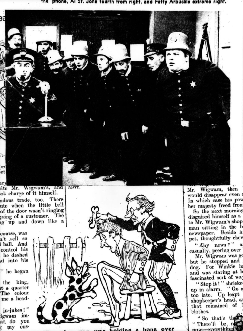 Une page illustrée d'une revue. Nous voyons des policiers regardant leur chef parler au téléphone. En bas de la page, nous remarquons un dessin représentant deux hommes dont l'un tend un os à un chien