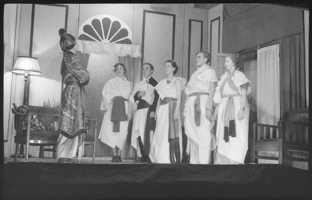 Sur la scène d'un théâtre, nous voyons des comédiens et des comédiennes évoluant dans le décor d'une maison bourgeoise. Nous remarquons que les comédiens sont placés en ligne et sont habillés d'un costume s'inspirant de la tenue des moines boudhistes. Devant eux, se tient un comédien portant un costume issu du folklore arabe