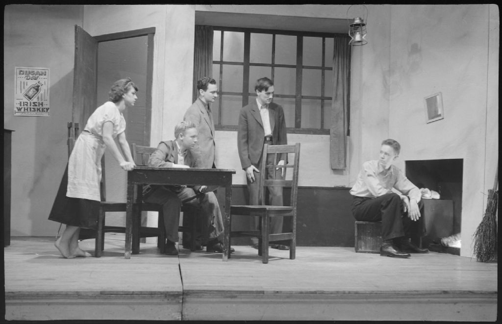 Sur la scène d'un théâtre, nous voyons une comédienne et quatre comédiens. Nous remarquons certains éléments du décor comme le fanal, le foyer et une petite table où sont déposées des miches de pain ainsi qu'un balai fait de branches