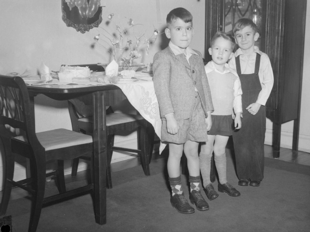 Des garçons sont réunis. Près d'eux, nous remarquons une table sur laquelle est posé un arrangement de branches où sont accrochées des cannes de Noël