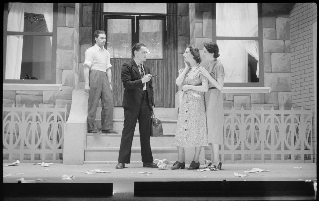 Sur la scène d'un théâtre, nous voyons deux comédiens et deux comédiennes évoluant dans le décor représentant une scène de rue. Un des comédiens tient un sac de voyage et fume une cigarette