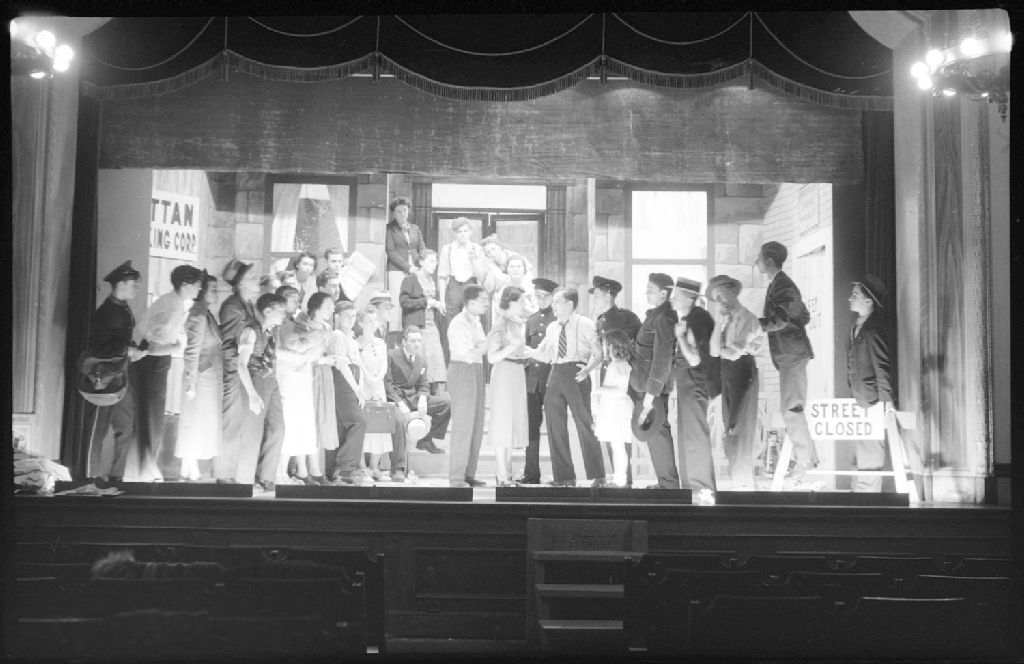 Sur la scène d'un théâtre, nous voyons une troupe de comédiens et de comédiennes évoluant dans un décor représentant une scène de rue. Nous remarquons un comédien déguisé en postier, son sac en bandoulière