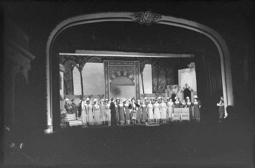 Sur la scène d'un théâtre, nous voyons une troupe de comédiens et de comédiennes évoluant dans un décor exotique. Nous remarquons au centre un comédien habillé en costume écossais avec le kilt. En arrière-plan, nous remarquons des comédiens en costume de militaires avec le chapeau colonial. Sur le côté, nous voyons un machiniste qui regarde le spectacle