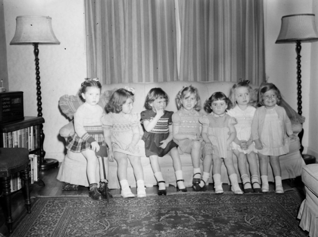 Des fillettes sont réunies dans le salon d'une maison cossue. Nous remarquons une radio sur une bibliothèque à deux rayons ainsi que deux lampes sur pied