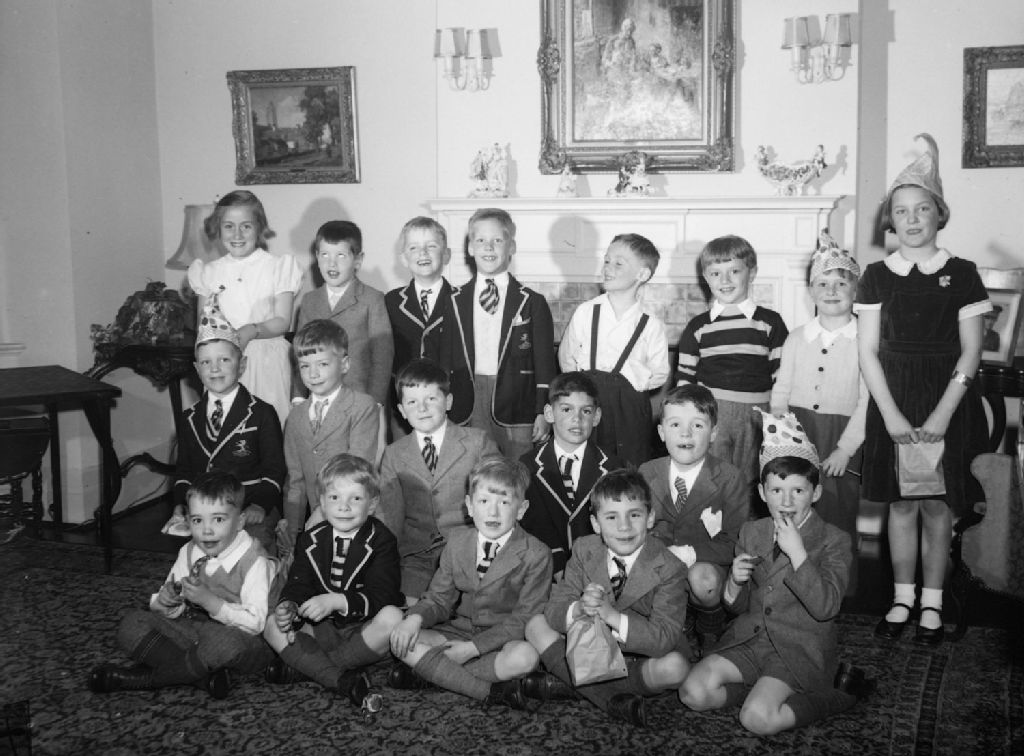 Des enfants sont réunis dans le salon de la famille Thom pour célébrer un anniversaire. Quelques enfants sont coiffés de chapeaux de fête. Nous remarquons les tableaux, les luminaires ainsi que le foyer sur lequel reposent des figurines en porcelaine