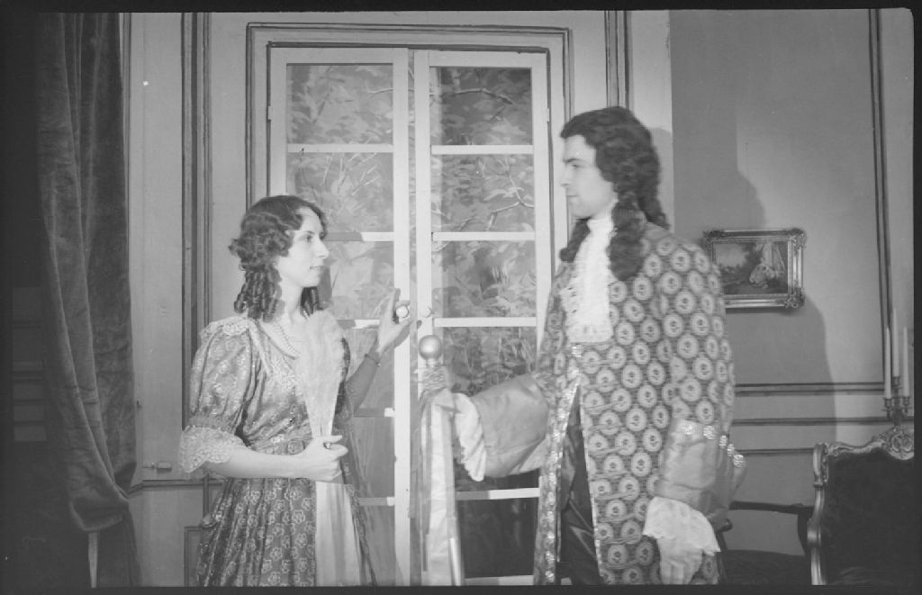 Sur la scène d'un théâtre, nous voyons un couple de comédiens (Yvette Lorrain et Léon Noël de Tilly) jouant la pièce «Les femmes savantes» de Molière. Les comédiens sont en costume d'époque avec des perruques. L'homme tient une canne à pommeau