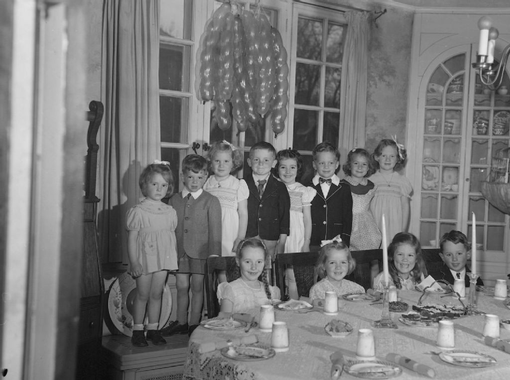 Dans la salle à manger de la famille Keay, des enfants sont réunis pour célébrer un anniversaire. Nous remarquons la vitrine renfermant un service à vaisselle, le lustre, les portes françaises et la cage à oiseau