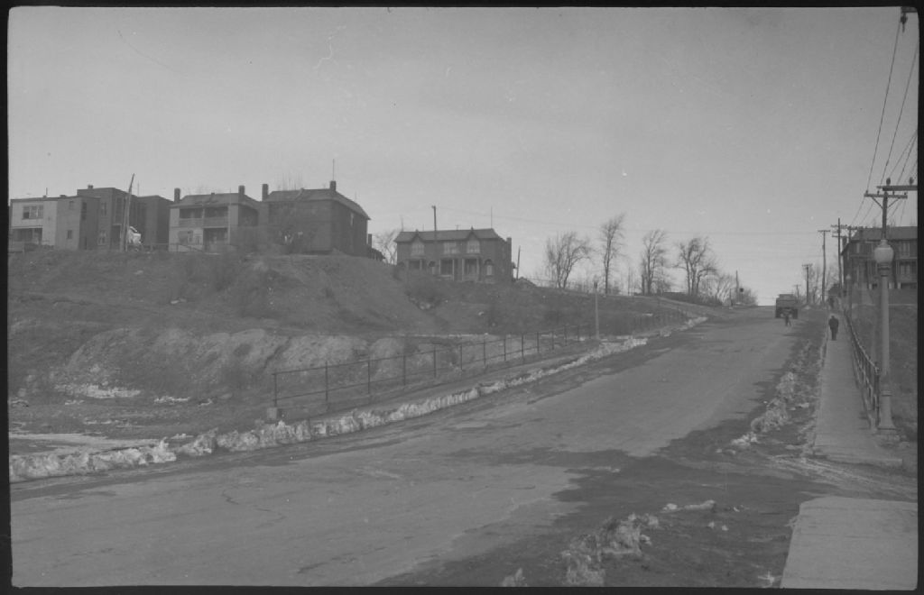 Nous voyons l'avenue Maple à ville Saint-Pierre. Nous remarquons les maisons à logements multiples, le pont avec ses lampadaires et un camion stationné