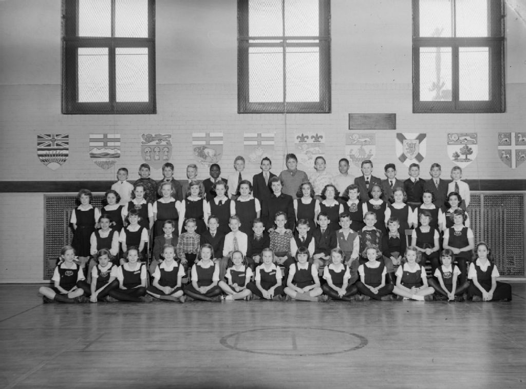Des élèves sont réunis dans le gymnase de l'école King, située au 4740, avenue Western à Westmount. Nous remarquons sur le mur les armoiries des provinces canadiennes