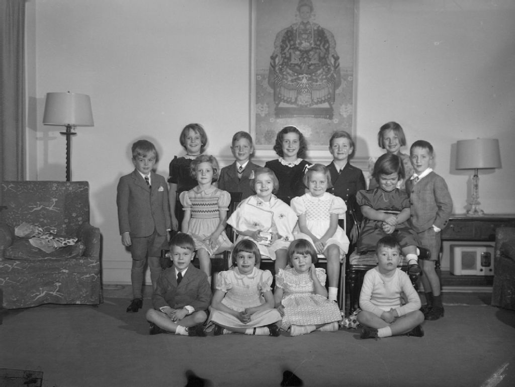 Des enfants sont réunis dans le salon de la famille Wright. Nous remarquons le mobilier, les lampes et la radio sous la table d'appoint. Nous voyons un tableau d'art chinois