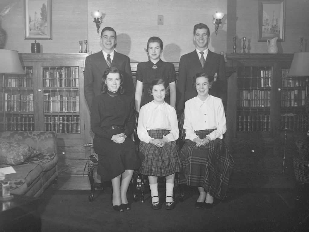 Des membres de la famille Peckham sont réunis dans un salon. Nous remarquons les bibliothèques vitrées