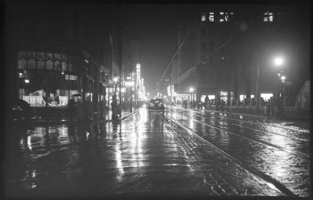 Nous voyons la rue Sainte-Catherine Ouest à l'intersection de la rue Union à Montréal, sous la pluie. Nous remarquons les commerces suivants: la bijouterie «Henry Birks and Sons», le restaurant «Cosy», le théâtre «Palace», le café «Capitol». De l'autre côté de la rue, nous apercevons la cathédrale «Christ Anglican» et le magasin «Eaton»