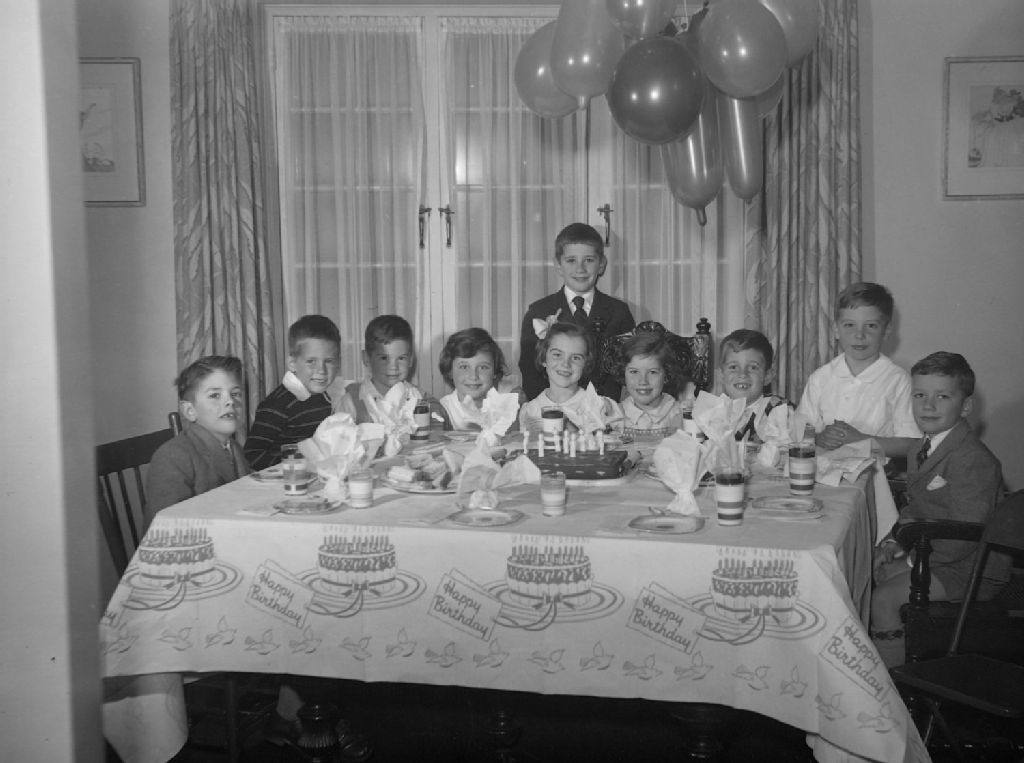 Des enfants sont réunis autour d'une table pour célébrer l'anniversaire de Dudley Kerr. Nous remarquons le gâteau décoré de figurines, les ballons et les portes françaises de la salle à manger