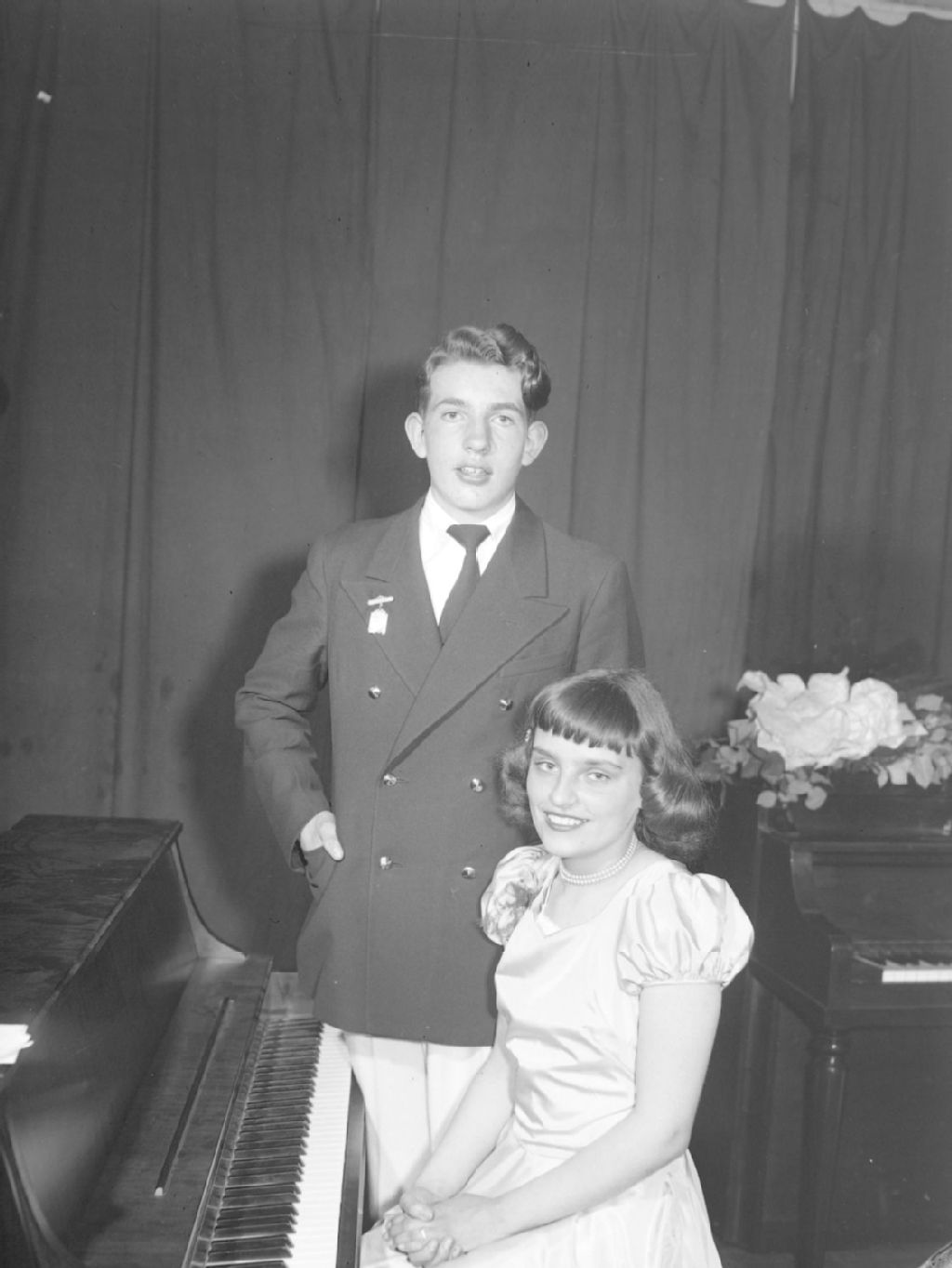 Une jeune fille, Bernice Ivanicki, est assise au piano. Un jeune garçon en complet, Desmond Saunders, se tient debout près d'elle. Nous remarquons un deuxième piano sur lequel sont déposées des fleurs