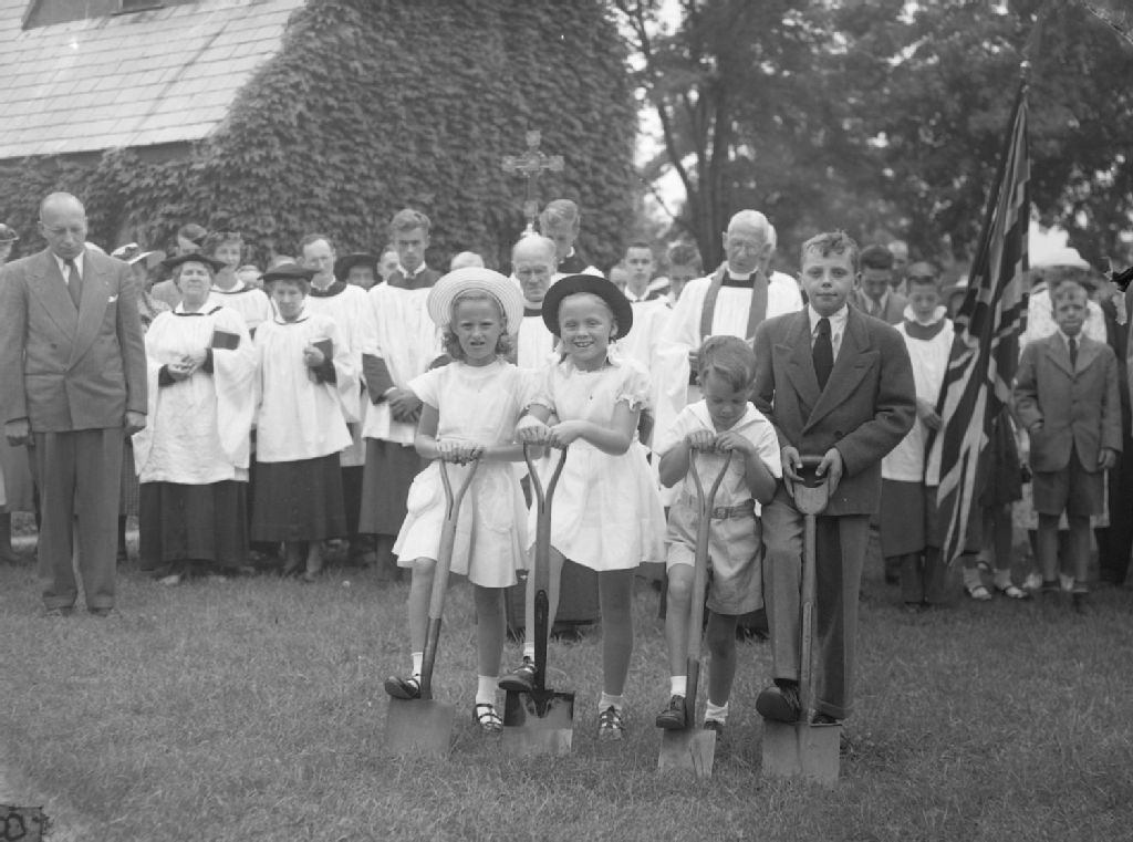 Cérémonie marquant le début des travaux d'érection de l'église anglicane Saint-Phillips, située sur la rue Sherbrooke Ouest à Montréal-Ouest. Nous remarquons les filles et les garçons avec leur pelle, le pasteur anglican, la croix de procession et les membres de la chorale vêtus de leur costume religieux ainsi que le drapeau Union Jack