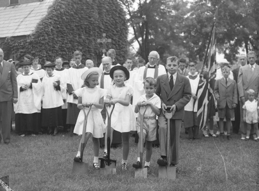 Cérémonie marquant le début des travaux d'érection de l'église anglicane Saint-Phillips, située sur la rue Sherbrooke Ouest à Montréal-Ouest. Nous remarquons les filles et les garçons avec leur pelle, le pasteur anglican, la croix de procession et les membres de la chorale vêtus de leur costume religieux ainsi que le drapeau Union Jack