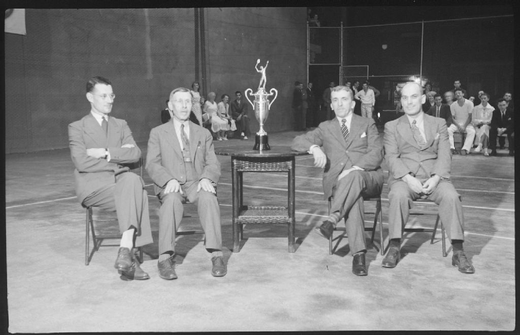 Sur un court de tennis, nous voyons quatre hommes en complet assis autour d'une petite table sur laquelle est déposé le trophée d'une compétition de tennis. Ces personnes sont identifiées comme étant: Jean Charest, Jacques-Janvier Joubert (président-fondateur de la laiterie J.J. Joubert), Napoléon Charest et Joseph Martin. En arrière-plan, nous apercevons des personnes qui regardent la scène