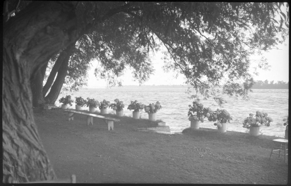Nous voyons les abords du canal Lachine. Nous remarquons les arbres, les pots de fleurs et un banc